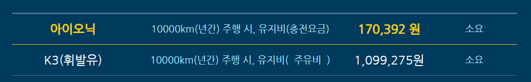 아래는 환경부 전기차 충전소 홈페이지에서 전기차와 휘발유차의 유지비 비교 시뮬레이션을 돌린 결과이다. K3 휘발유 차량보다 아이오닉 전기차가 훨씬 저렴함을 알 수 있다.