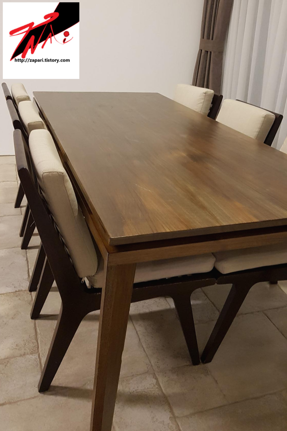 식탁도 나무 느낌과 모던이 어우러짐. 바닥 타일과 커튼도 배색을 신경쓴 느낌입니다.